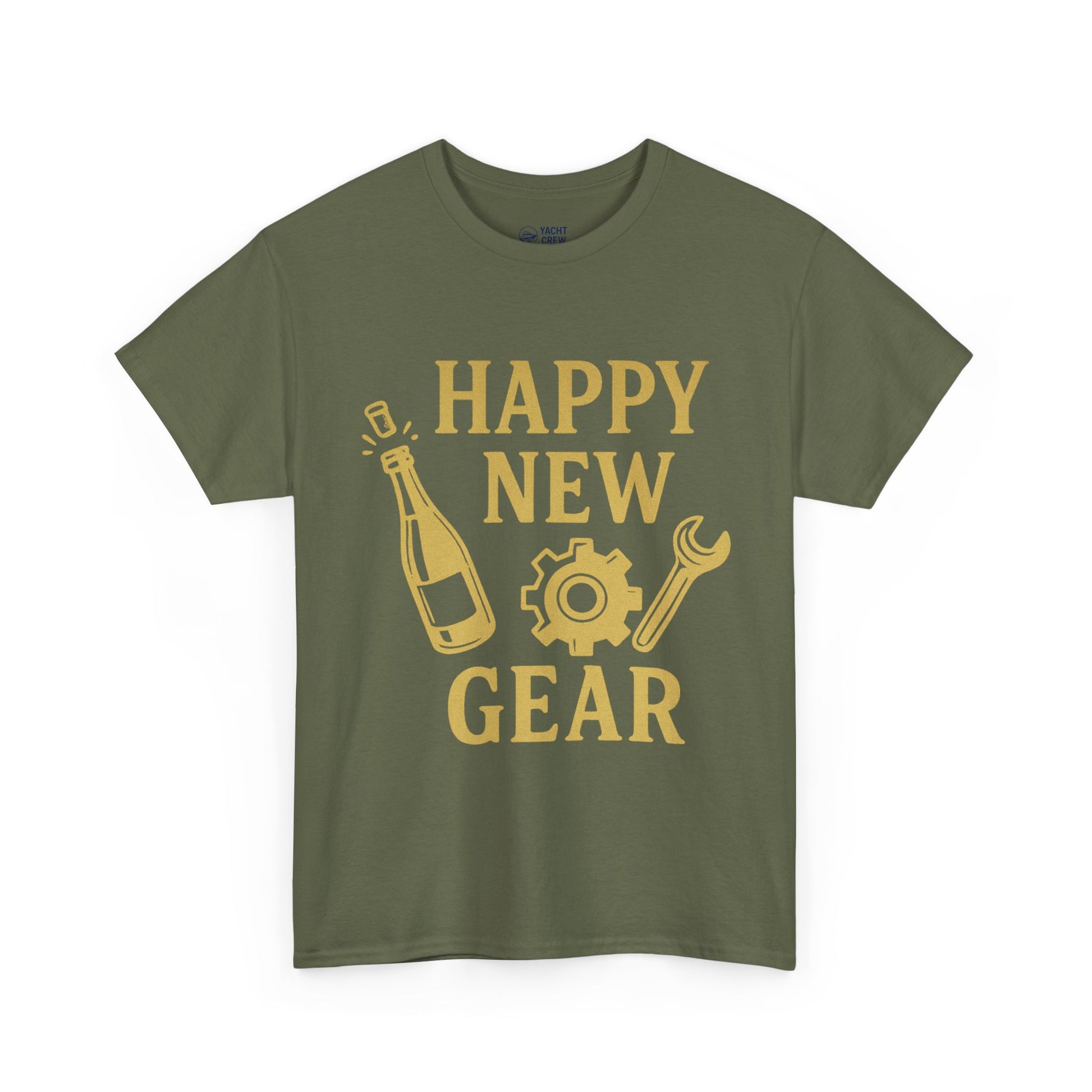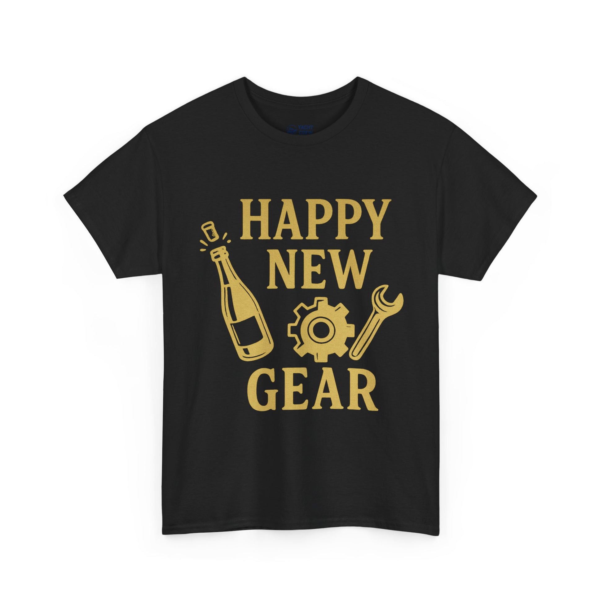 Happy New Gear T-Shirt — Funny New Year Mechanics Tee with Champagne & Wrench Design