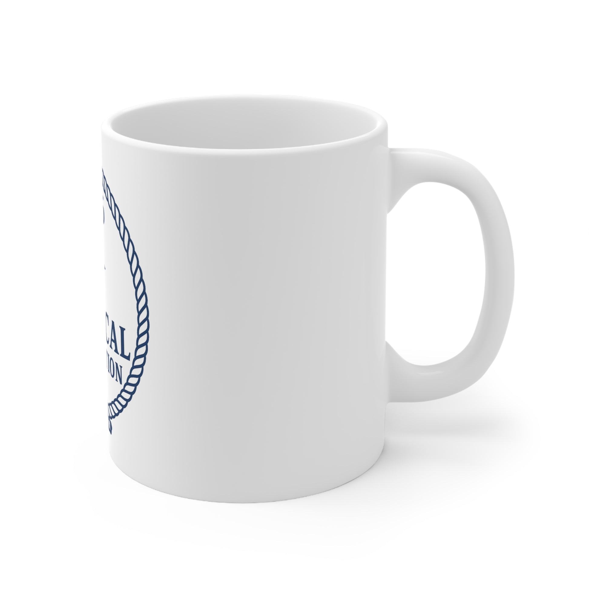 A crisp white ceramic mug stamped with a blue nautical emblem — rope frame, compass rose, and the year 2026 — that brings the calm confidence of the harbor to your morning brew. It sits solid in hand thanks to a C-shaped handle and a glossy finish that makes the deep navy print pop. This mug feels at home on a weathered dock table or tucked into a cozy galley while you plan a weekend sail. The restrained maritime design speaks to people who love charts, sea spray, and the quiet ritual of coffee before casting off. Dishwasher- and microwave-safe, it blends everyday convenience with a little seafaring charm for reunions, regattas, or quiet mornings remembering voyages.
